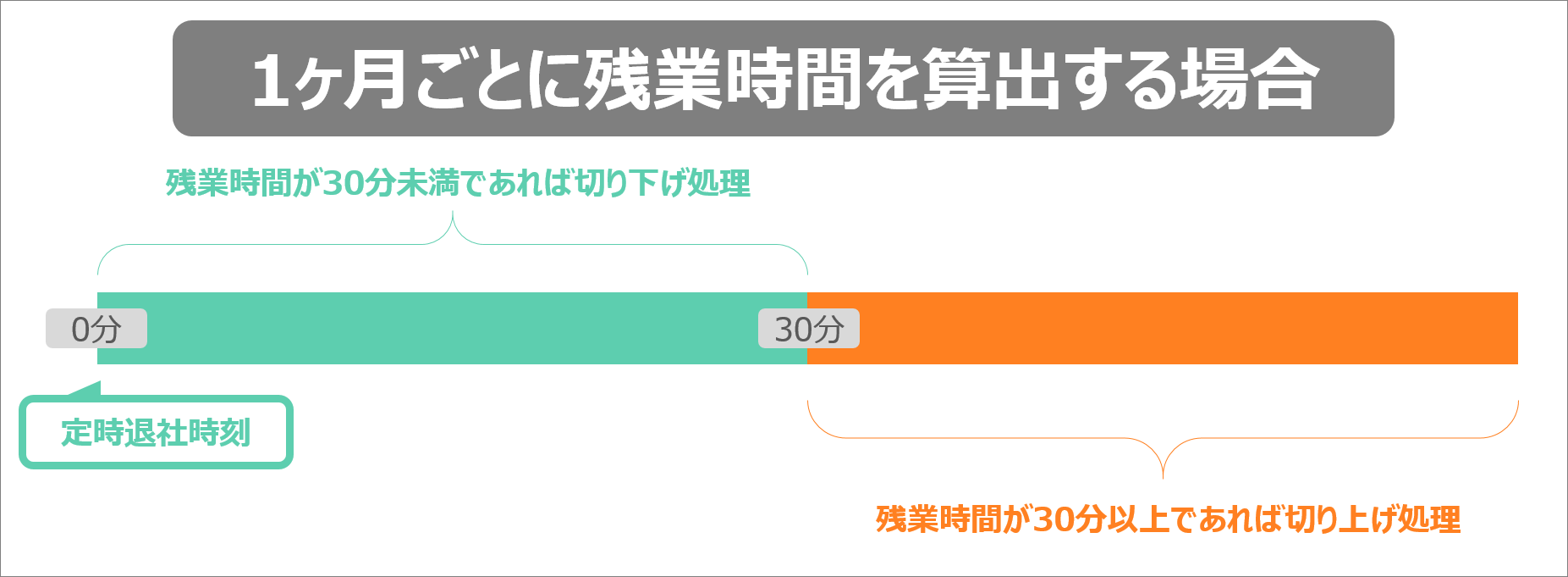 たとえば15分単位で残業代を把握し、15分未満の端数を切り捨てる運用は、15分未満の時間分の賃金を払っていないことになります。つまり、 賃金の一部しか払っていないとして、上記③「全額払いの原則」に反することとなり、違法となります。. 1日の残業時間は、1分単位で把握するのが基本です。 1時間未満や30分未満を切り捨てるような取り扱いが認められないことはもちろん、「15分未満は切り捨て、15分以上は30分として切り上げる」という取り扱いも不適切とされているため注意が必要です。