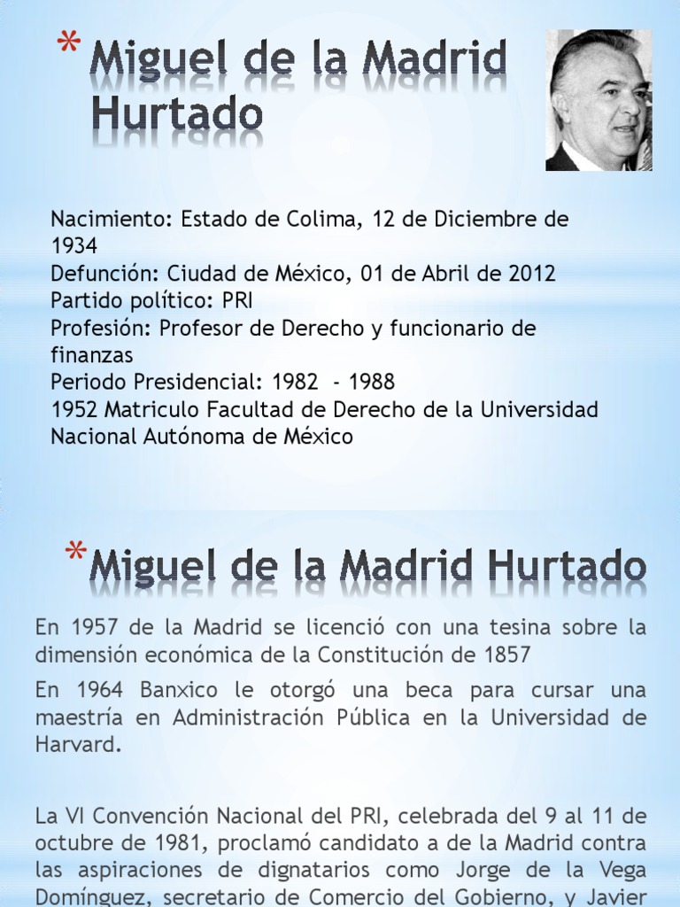 Miguel de la Madrid (born December 12, 1934, Colima, Mexico—died April 1, 2012, Mexico City) was the president of Mexico from 1982 to 1988.. Miguel de la Madrid received a degree in law from the National Autonomous University of Mexico (UNAM) in Mexico City in 1957 and a master’s degree in public administration from Harvard University in 1965. He worked for the National Bank of Foreign.. Principales aportaciones de Miguel de la Madrid Hurtado quien fue un político de nacionalidad mexicana, y presidente de dicha República durante el sexenio comprendido desde 1982 a 1988.. Logros financieros. De la Madrid logró privatizar una gran cantidad de empresas estatales; además de realizar un acuerdo con los empresarios y.
